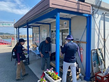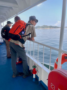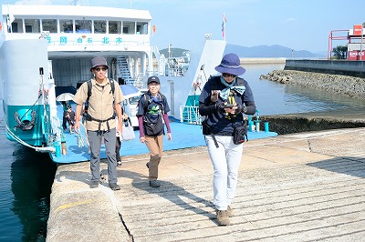 白石島に到着して、いつの間にか皆さん船から降りた状態です。いったん戻って北木島にわたり、北木島〜白石島にわたるのが一番早く行けるということでそうします。