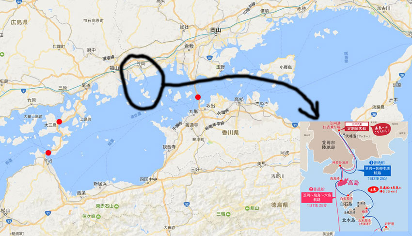 | 【9/15】福山ホテルR9(7:00)―笠岡フェリー乗り場(8:15)―(フェリー北木島降船失敗)―北木島豊浦港―秋葉山―豊浦港―白石島港―展望台―白石島港―笠岡フェリー乗り場―中華そば「いではら」―自宅 |