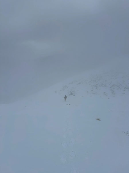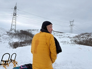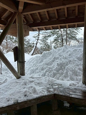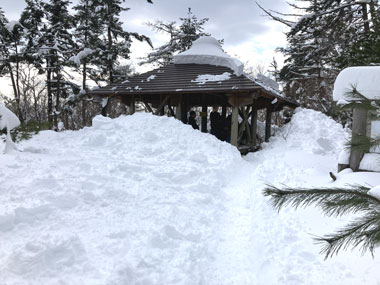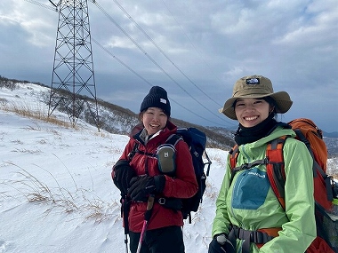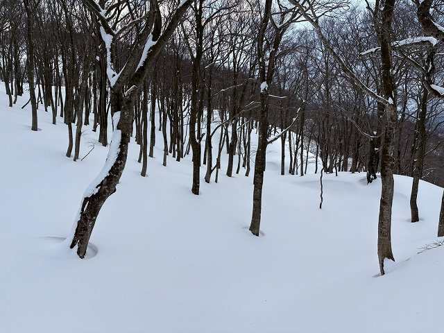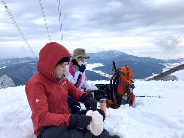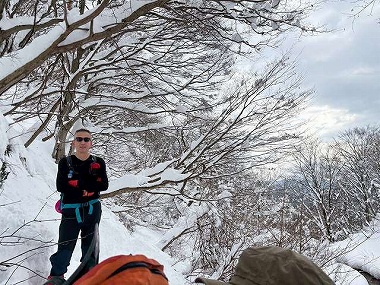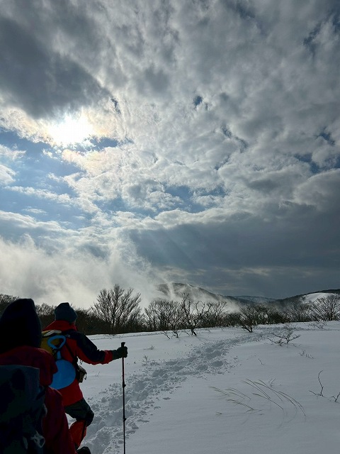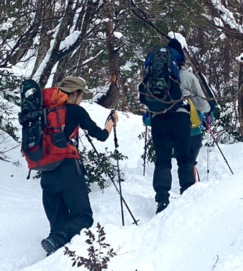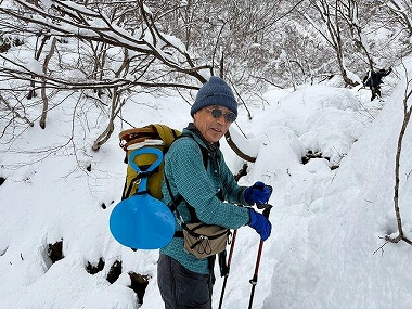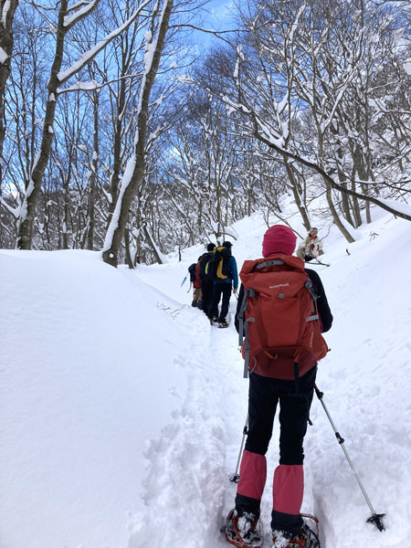 | 今回はスノーシュー初めての2人の歩行体験でマキノスキー場から赤坂山から寒風の予定で行ってきましたが、下山時にスノーシューを貸した2人のかなり年期の入ったかんじきで下山していたところ、かんじきが壊れ強烈なツボ足下山となりました。 |