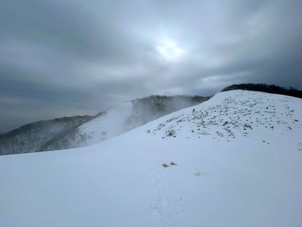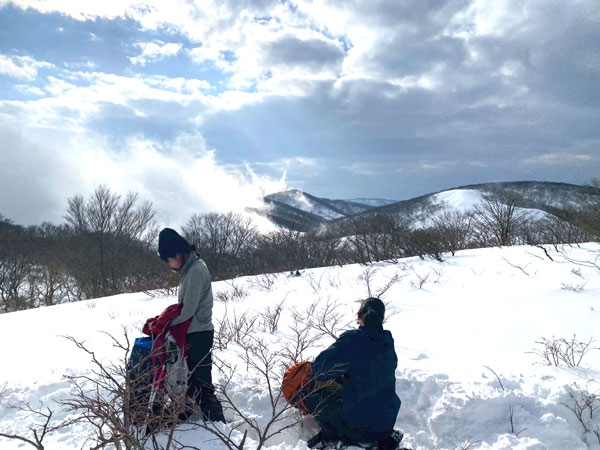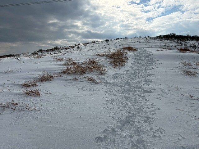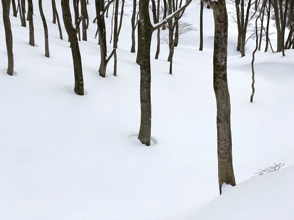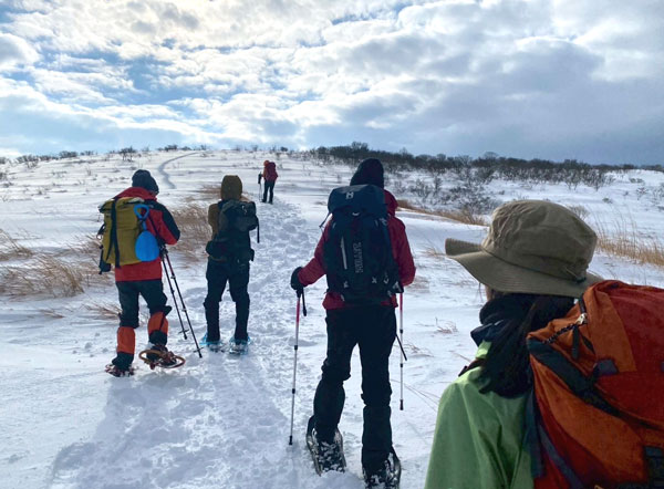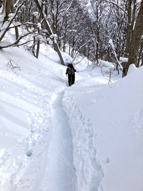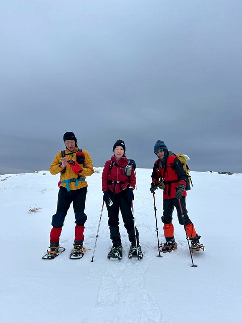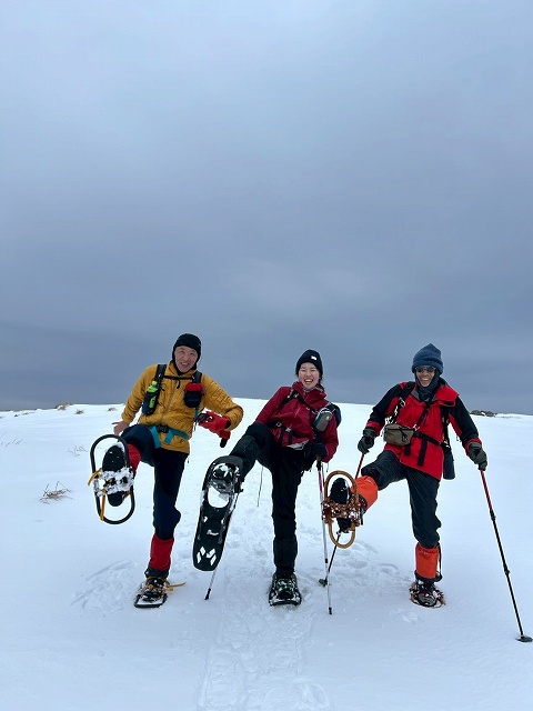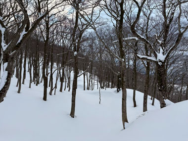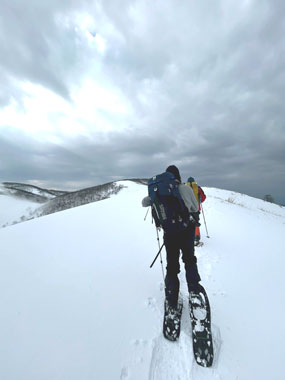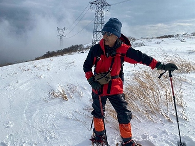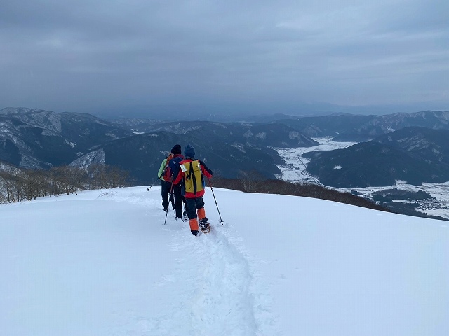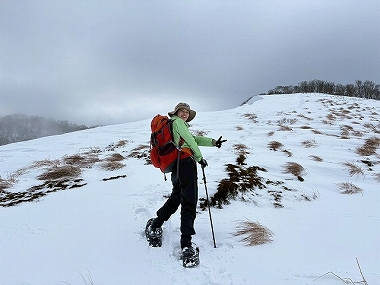 | 今回はスノーシュー初めての2人の歩行体験でマキノスキー場から赤坂山から寒風の予定で行ってきましたが、下山時にスノーシューを貸した2人のかなり年期の入ったかんじきで下山していたところ、かんじきが壊れ強烈なツボ足下山となりました。 |