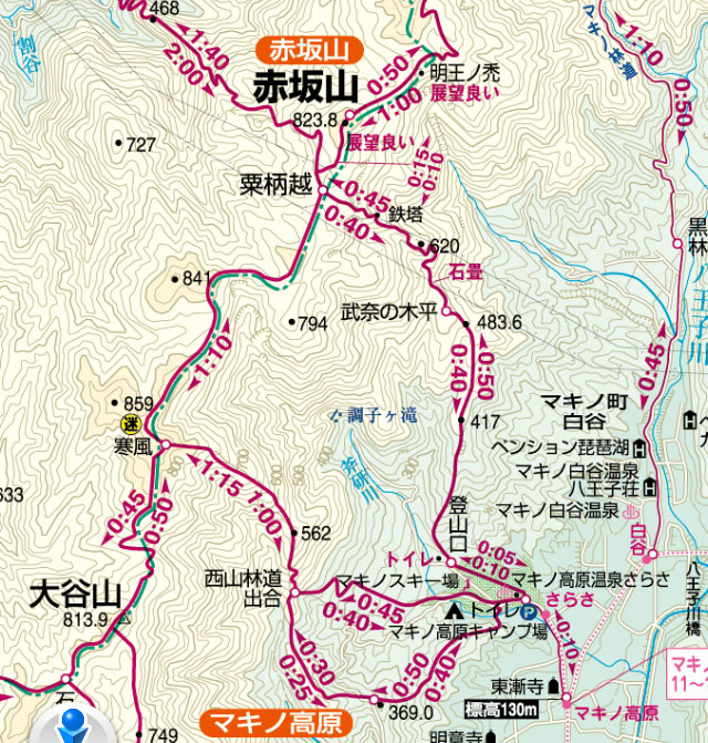 | 自宅(6:40)---マキノ高原P(10:00)―(12:00)粟柄越(昼飯13:00)―(14:30)寒風―(18:30)マキノ高原P―温泉サラサ―自宅 |