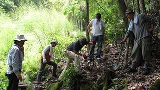 【内容】宮立付近の暑い夏の間に伸びた草刈りと、イノシシが掘り返した階段の修復。