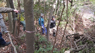 | 箕作山頂上から腰越峠へ下るルートは頂上直下で50m程が急斜面。今日はここに階段とトラロープを取り付ける作業です。 |