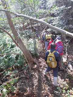 | 午後からは、次に整備を行うルート踏査です(腰越南尾根ルート)。このルートが完成すると、南箕作山から北箕作山までの縦走ルートが完成です。 |